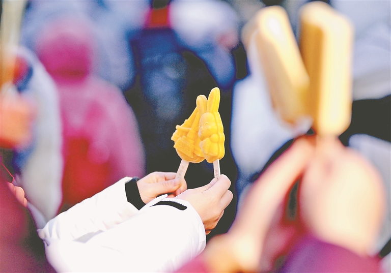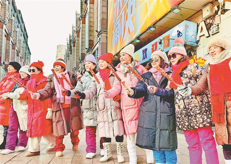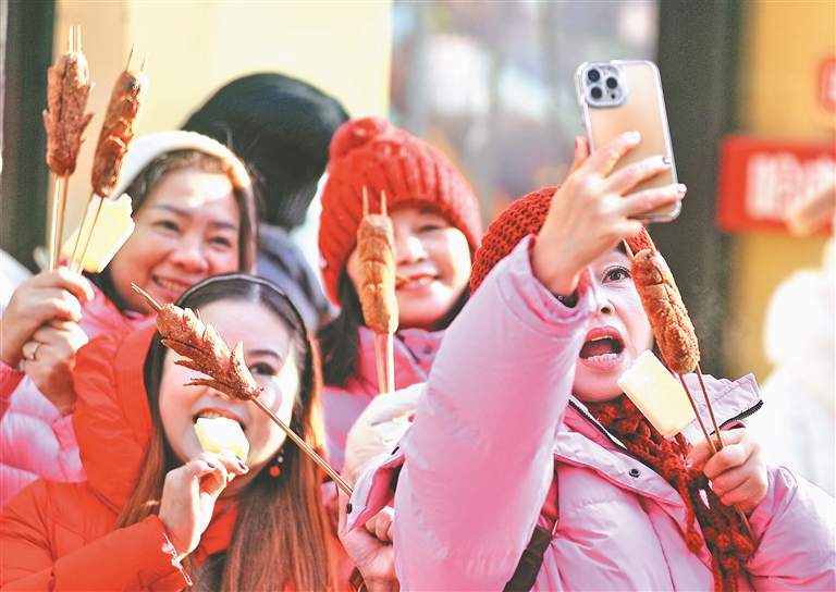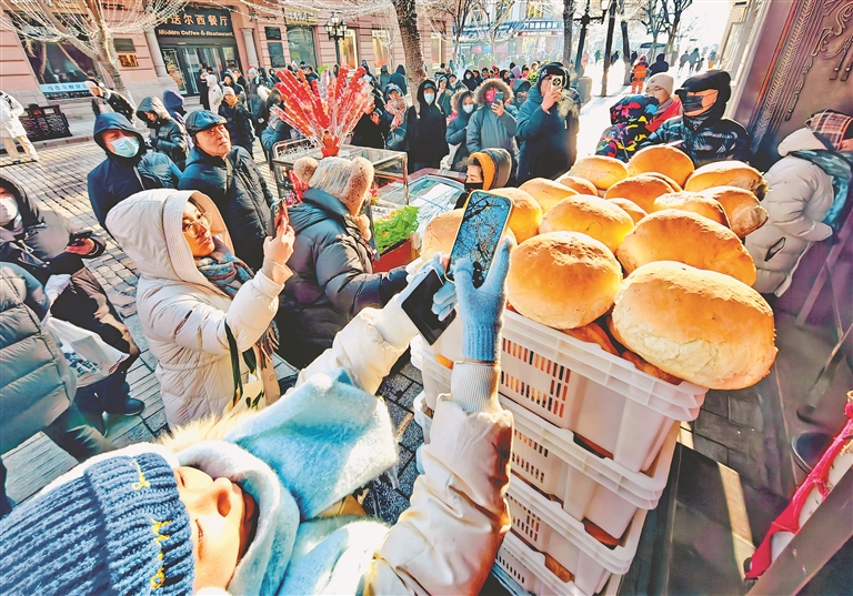 近日,哈尔滨市道里区中央大街上,来自南方的旅游团一个接着一个。游客们在游览美丽风景的同时,纷纷购买、品尝本地的特色美食。大列巴面包、烟囱面包、冻梨汁、烤红肠、冰棍、冰糖葫芦等食品销量大增。品尝美食前,先拍张照片发朋友圈成为“规定动作”。