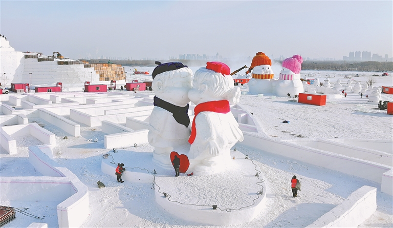 近日,哈尔滨市的“雪人军团”再添新丁。位于松北区的一处在建冰雪乐园中,两对大雪人落成,其中一对亲吻雪人尤其亮眼。这两组雪人,都十余米高,坐落在松花江畔,被雕刻得惟妙惟肖。本报记者 张澍摄