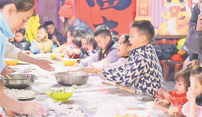 当日晚8时30分,温馨欢乐的包饺子活动拉开跨年序幕,和面、擀皮、调馅……居民和游客欢聚一堂,共同动手包饺子,用传统美食迎接新年的到来。在美食区,游客们也排起长长的队伍,吃上一口热乎乎的饺子,感受北极漠河的温暖。