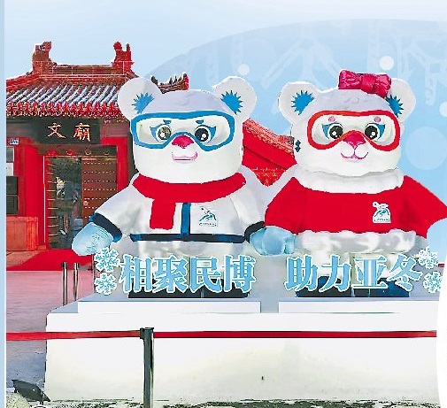 省民族博物馆馆区正门,“滨滨”身着运动服饰,姿态矫健,寓意着亚冬会运动员们在赛场上奋勇拼搏、挑战自我的体育精神。 而“妮妮”则以一种可爱且灵动的形象呈现,脸上洋溢着热情的笑容。