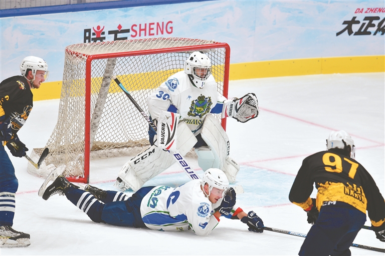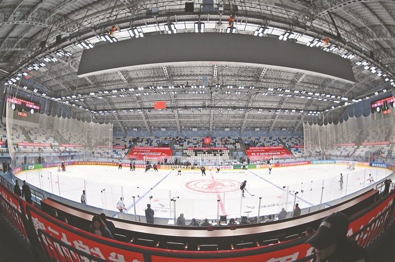 哈尔滨冰球馆进行的亚冬会冰球测试赛。