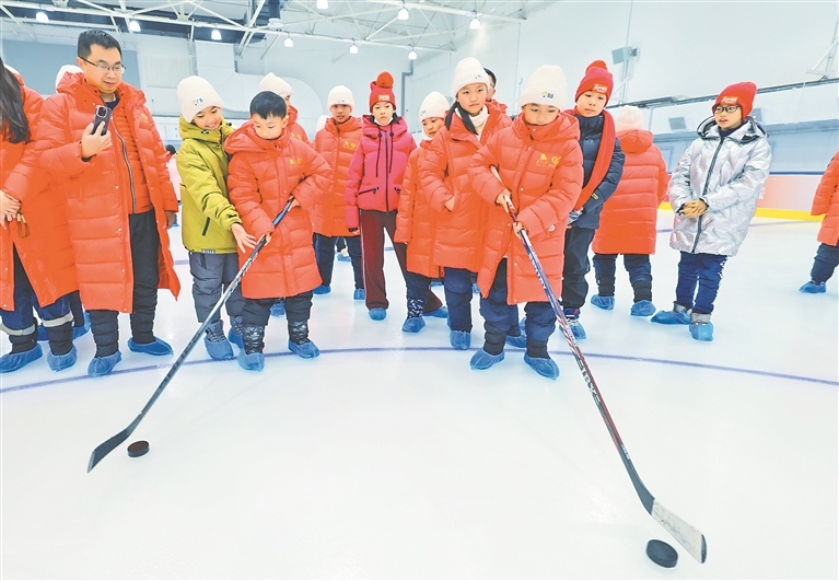 参加活动的学生在亚冬会场馆体验冰球运动。本报记者 郭俊峰摄