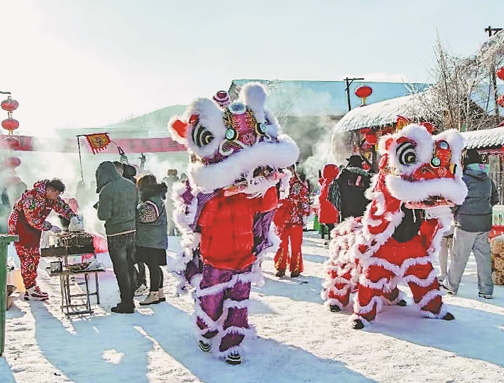 集市上,糖葫芦、大冻梨、冻柿子、雪人形状的小蛋糕、热气腾腾的奶茶、滋滋冒油的肉串,引得游客纷纷驻足品尝。霸气的威风锣鼓、欢腾的舞狮子……交织成一曲欢乐的乐章。