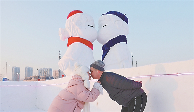 哈尔滨市松花江畔的“亲亲雪人”。 本报记者 张澍摄