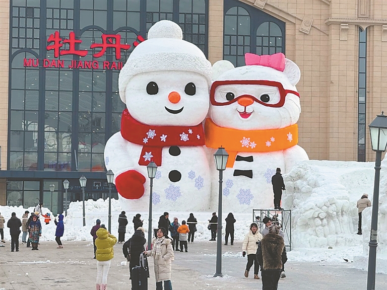 牡丹江火车站北广场上的“拥抱亚冬”主题大雪人。王金成摄