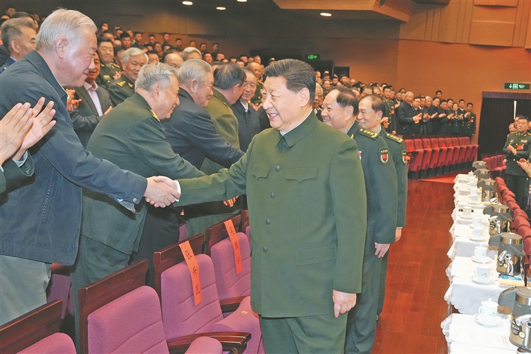 下午4时许,习近平来到老同志中间,全场响起热烈掌声。习近平同大家亲切握手、互致问候,关切询问他们的身体和生活情况,共同回顾过去一年党、国家和军队事业走过的不平凡历程、取得的重大成就。老同志们一致表示,要更加紧密地团结在以习近平同志为核心的党中央周围,坚持以习近平新时代中国特色社会主义思想为指导,深入贯彻习近平强军思想,深刻领悟“两个确立”的决定性意义,坚决做到“两个维护”,贯彻军委主席负责制,弘扬光荣传统、永葆政治本色,坚定信心、团结奋斗,继续为打好实现建军一百年奋斗目标攻坚战,为以中国式现代化全面推进强国建设、民族复兴伟业作出积极贡献。