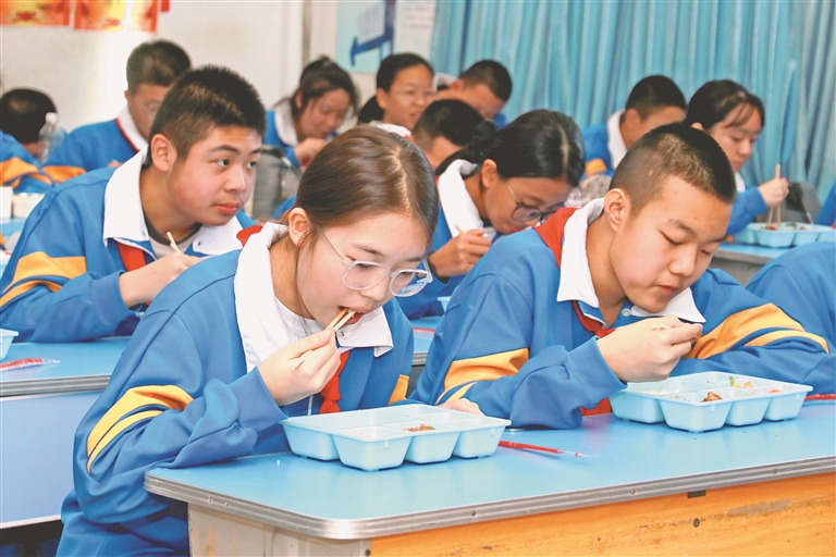 在学生用餐时,各班主任适时地进行思政教育,引导学生珍惜粮食、科学饮食、健康生活。班主任们深有感触:“通过对比我们发现,相比之前‘盒饭’配餐,‘桶装’配餐确实大幅减少了食物浪费。这种模式下,学生们几乎都能‘光盘’,很少有浪费的现象。”