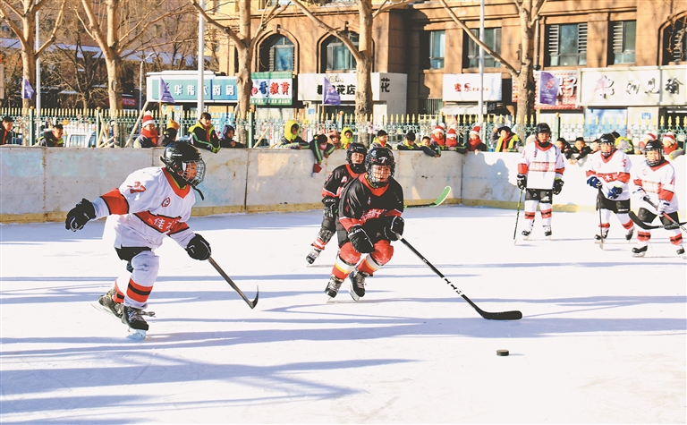 第十五小学第二届冰雪运动会上的冰球比赛。