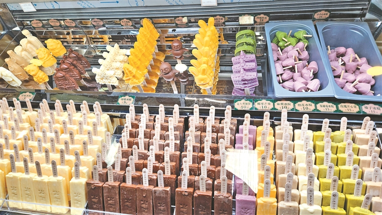 记者看到,店里冰品柜台里不仅有传统朗姆口味、原味冰糕,还有企业新研发推出的冰激凌蛋糕、威化奶油冰淇淋、奶茶雪糕、草莓雪糕、乳酸菌冰糕等,各种冰品让人垂涎欲滴。
