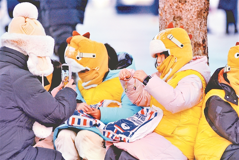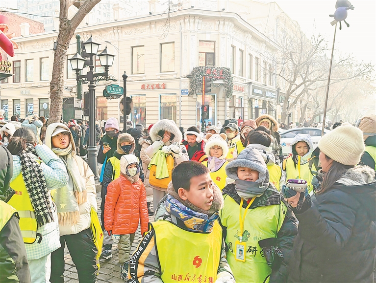 这些身着团队统一服饰、活泼可爱的孩子们,也成为了冰城街头一道流动风景线。