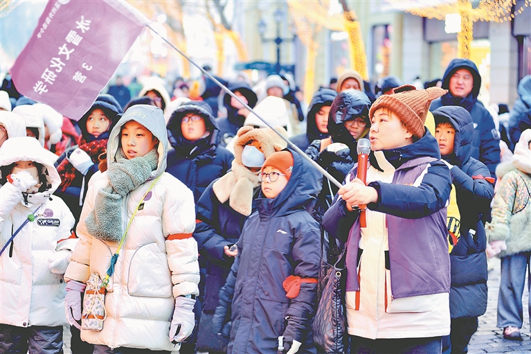 近日,哈尔滨市道里区中央大街上,来自浙江省的中小学生研学团在老师的带领下正在参观游览。老师向孩子们讲解了百年老街的由来、欧式建筑的特点等知识。