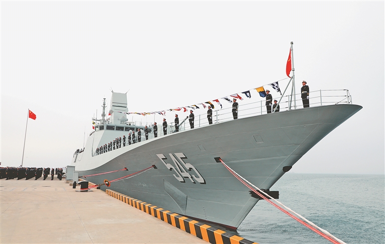 1月22日上午,中国人民解放军海军054B护卫舰首舰漯河舰在青岛某军港交接入列。漯河舰舷号为“545”,排水量约5000吨,是我国自主研制建造的新一代护卫舰,在舰艇隐身技术、作战指挥系统、火力集成控制等方面取得突破,各项性能显著增强。