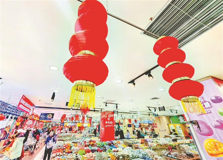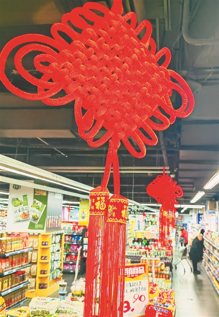 为迎接新春佳节的到来,超市里还挂上了红灯笼、中国结等饰品,烘托出浓浓的喜庆气氛。