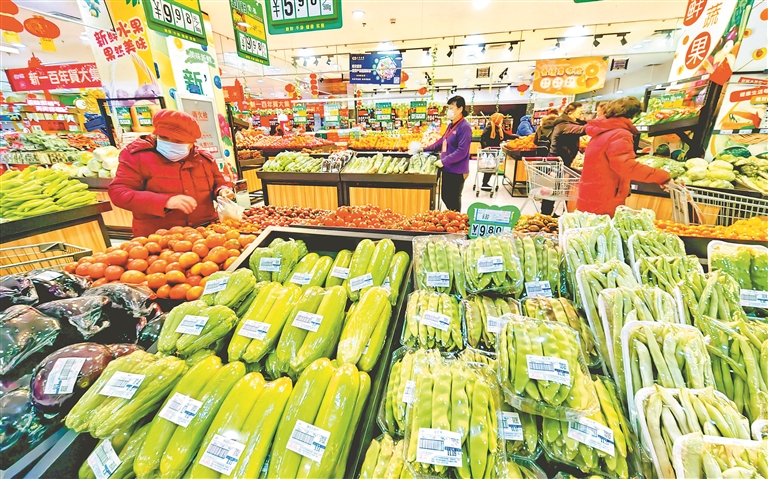 近日,哈尔滨市道里区一家超市内,市民们正在逛年货大集,购买各种节日用品。