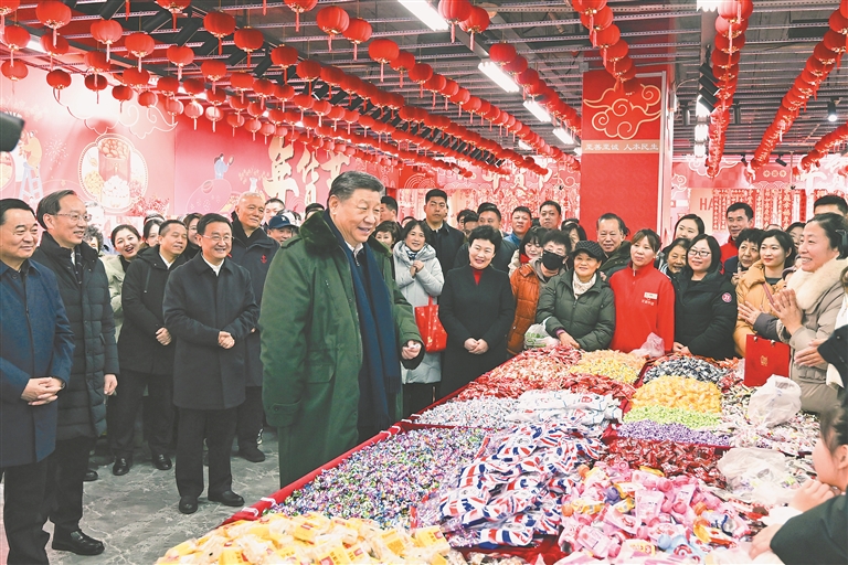 沈阳大东副食品商场历史悠久,富有特色的年节商品琳琅满目。23日上午,习近平来到这里,察看多家店铺,频频同店主和顾客交流,详细了解节日期间市场供应情况。大家见到总书记都十分激动,连声欢呼“总书记好”!习近平对大家说,“菜篮子”、“米袋子”、“果盘子”是民生大事,现在物质丰裕,过年团圆更要让大家吃得好、吃得健康。