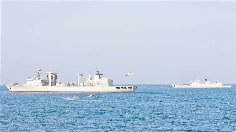 中国海军第46批护航编队组织反恐反海盗演练,舰、艇、机立体出动(2024年4月19日摄)。
