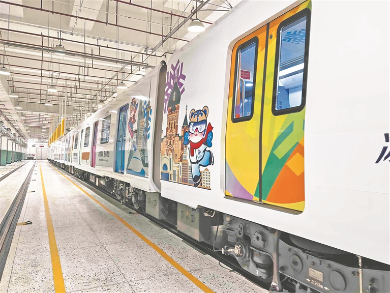 记者在哈尔滨地铁3号线安通街车辆段看到,主题专列车头印有第九届亚冬会会徽;车身以冰晶蓝、丁香紫、丰登黄、兴安绿为主色调;车身内外绘制了哈尔滨亚冬会的口号、愿景等。