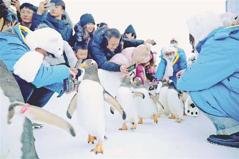 1月30日,大年初二,13时30分,哈尔滨极地公园的“淘学企鹅”冰雪大巡游正在进行中。极地广场上聚集了很多游客,外籍艺术家的唱乐表演和歌舞表演将巡游活动推向一波小高潮。哈尔滨极地公园原创IP、黑龙江冰雪天使“淘学企鹅”家族在“淘学走天下”音乐声中迈着小碎步出场,一出场就萌化了游客。