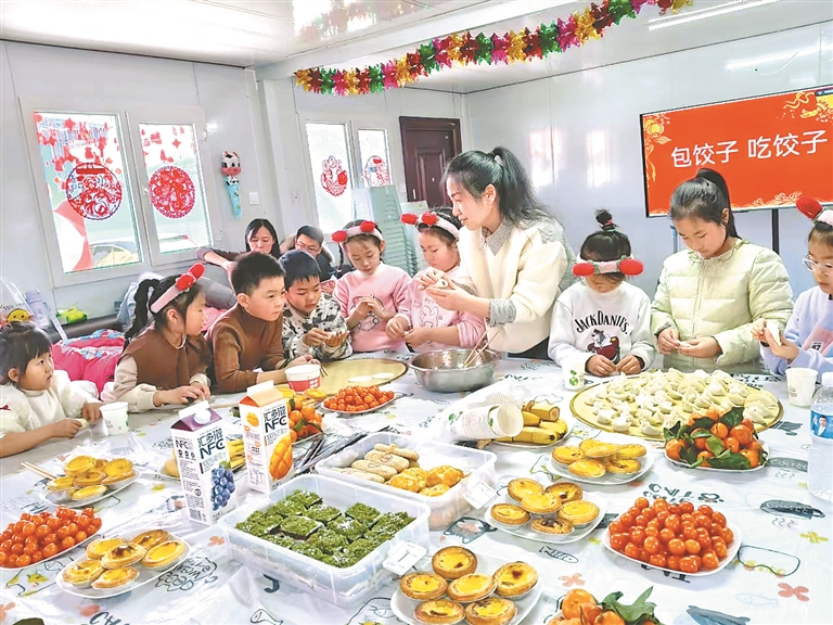 图为小朋友们学习包饺子。