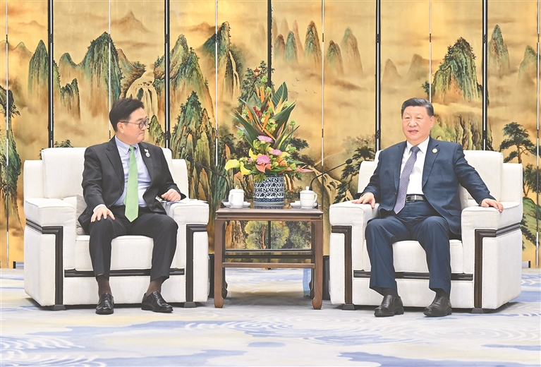 习近平指出,建交30多年来,中韩关系不断发展,促进了两国合作,也为地区和平发展作出了贡献。中国对韩政策是稳定的。当前国际和地区形势中的不确定性增多,中韩双方应该共同努力,巩固发展中韩战略合作伙伴关系。今年是中国人民抗日战争胜利80周年和韩国光复80周年,双方要搞好纪念活动。要深化相互交融、互利共赢的经贸关系,这符合两国人民共同利益。要增进人文交流,加强人民之间的友好感情。双方要相互支持今、明两年分别举办亚太经合组织领导人非正式会议。
