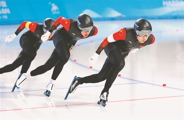 图③:2月10日,中国队选手高亭宇(右)、宁忠岩、廉子文(中)在比赛中。当日,第九届亚冬会速度滑冰男子短距离团体追逐赛在哈尔滨举行。中国队获得冠军。