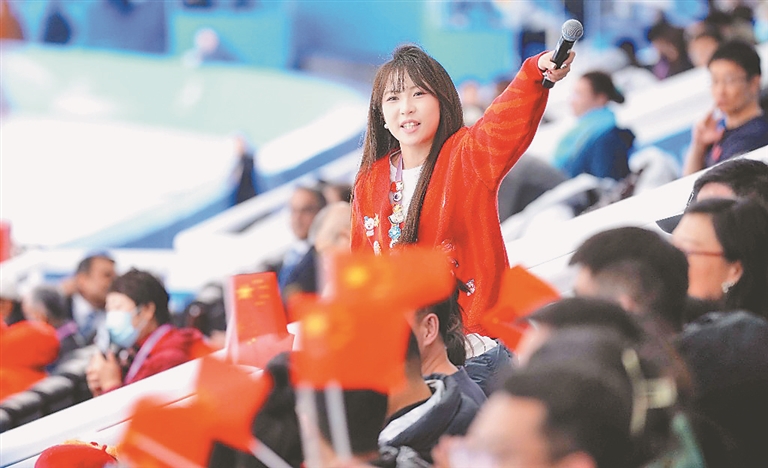 随着《奢香夫人》的旋律悠悠响起,“乌蒙山连着山外山,月光洒下了响水滩……”郑心怡清澈且极具穿透力的歌声在速滑馆内悠悠回荡。这熟悉又激昂的旋律,瞬间吸引了全场观众的目光。原本还沉浸在赛事中的观众,突然就被这美妙歌声所俘获。许多观众随着节拍轻轻摇摆身体,小朋友更是兴奋地舞动着手中的国旗大声跟唱。观众被激情感染,尽情释放着内心的热情,欢呼声、歌声交织在一起,一浪高过一浪。