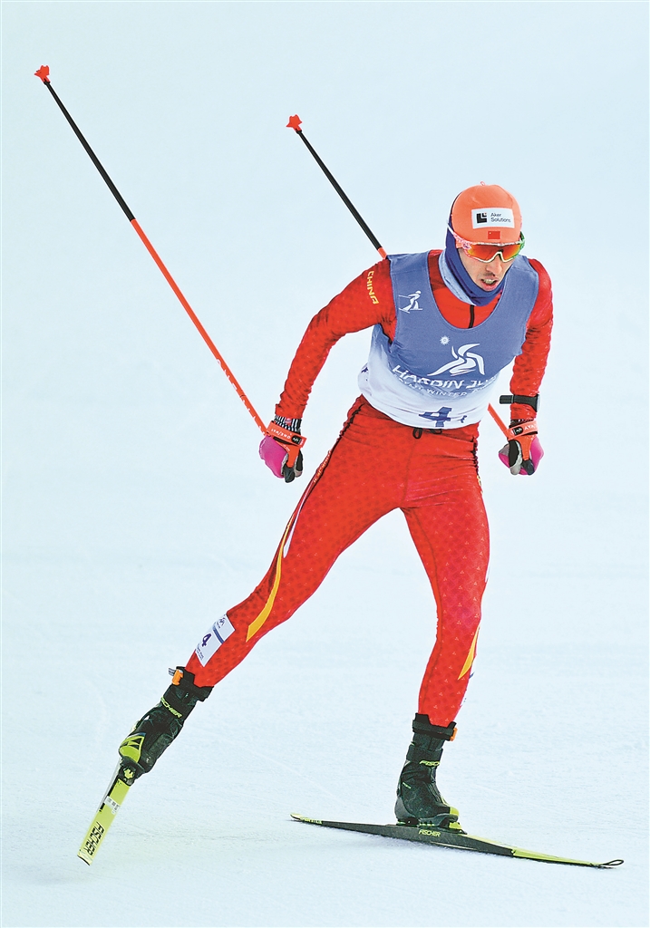 2月12日,中国队选手王强在比赛中冲刺。当日,第九届亚冬会越野滑雪男子4×7.5公里接力决赛在亚布力举行。中国队获得冠军。 新华社发