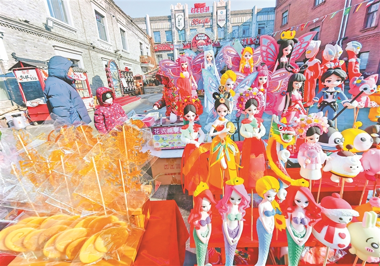 图②:哈尔滨市道外区中华巴洛克历史文化街区里,制作糖画、面人等工艺品的艺人纷纷出摊,为游客展示传统手工技艺。