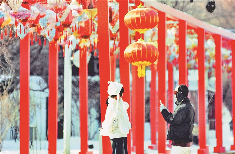 图④:在哈尔滨市松花江畔,喜庆的红灯笼吸引人们观看拍照。