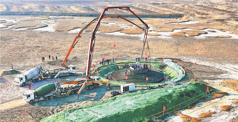王保峰说,每台风机下的混凝土基础要打32根桩,每根要打入地下27米~32米深。“我们现在主要的工作就是打混凝土基础,每个大体积混凝土承台要用约500立方米混凝土,目前已经完成了10个。”