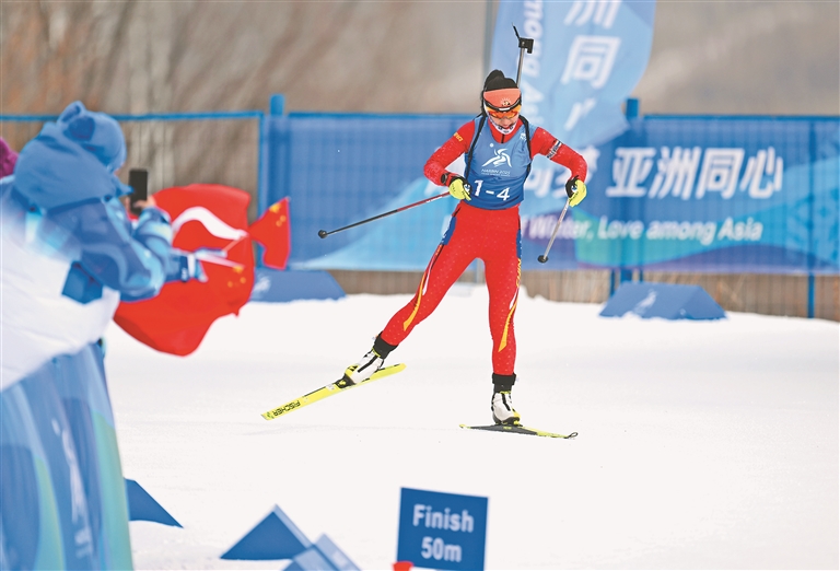 上图:13日,在第九届亚冬会冬季两项女子4×6公里接力比赛中,中国队获得冠军。