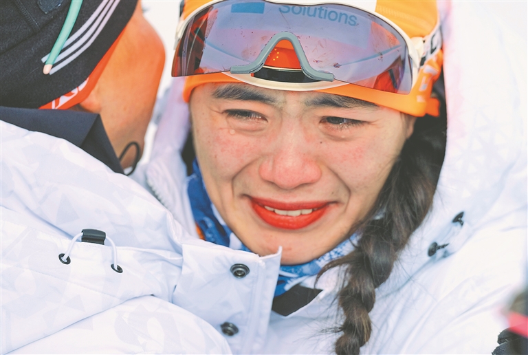 冬季两项女子4×6公里接力比赛中,中国队上演大逆转,当孟繁棋冲过终点时,唐佳琳泪洒赛场。本报记者 蒋国红摄