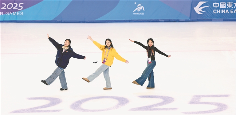 13日晚,在黑龙江省冰上训练中心综合馆,短道速滑与花样滑冰比赛全部结束,志愿者与工作人员在冰场上合影留念依依作别。