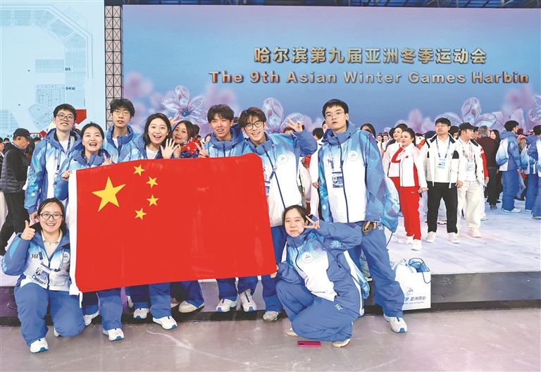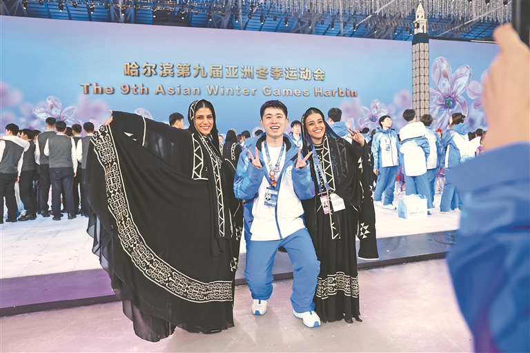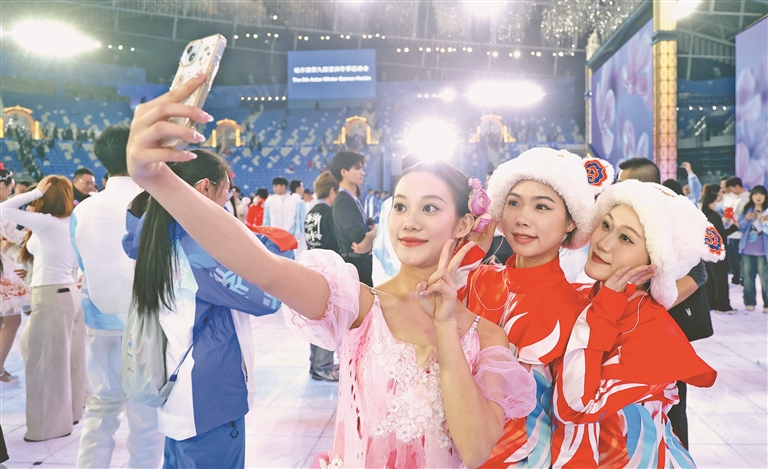 14日,第九届哈尔滨亚冬会闭幕。精彩绝伦的闭幕仪式结束后,演职人员在舞台上兴高采烈合影留念并与舞台告别。