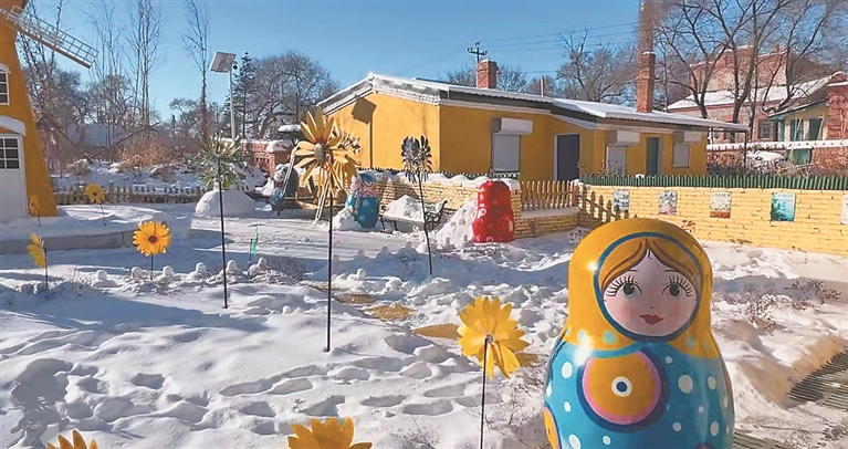 齐齐哈尔市罗西亚大街,蓝天、白雪还有在阳光下有着淡黄色墙体的俄式建筑,颜色鲜艳的套娃、欧式路灯、花箱、木质座椅……构成了一幅浓郁的“异国”景观图。
