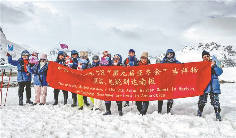第九届亚洲冬季运动会在哈尔滨举办前夕,地球最南端,神秘而壮丽的南极大陆上,一位特殊的“使者”,邀请到数位来自异国他乡的游客与他一起展开了一条印有“中国·黑龙江·哈尔滨‘第九届亚冬会’吉祥物滨滨、妮妮到达南极”中英文字样的宣传条幅,为第九届亚冬会加油,为哈尔滨喝彩!