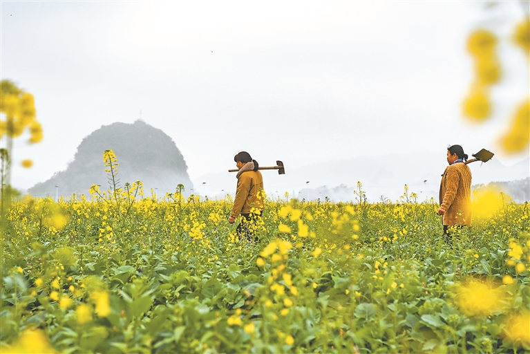 2月18日,在广西兴业县,两名村民扛着农具下田劳作。