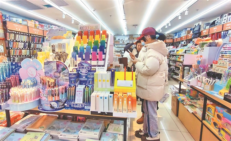 在文教用品专柜里,各种笔记本、款式新颖的笔、不同颜色的文具盒、书包等琳琅满目,应有尽有。销售人员介绍,新学期即将开始,文具的销售量持续增多。家长为孩子挑选文具时,更倾向于选择环保的产品。