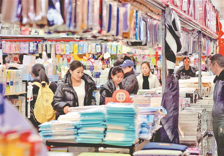 19日,哈尔滨市道里区一处大型批发市场,许多家长带着孩子前来选购文具。