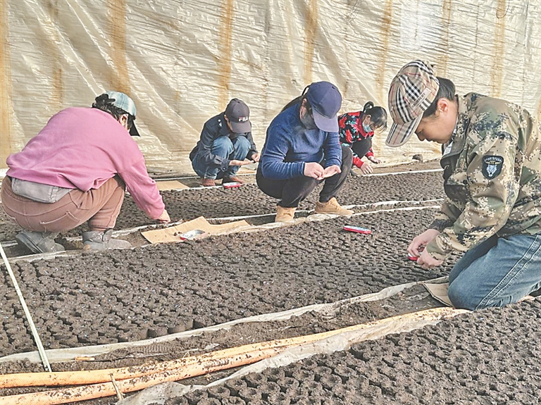 时下,绥化市明水县明水镇向荣村果蔬大棚种植基地迎着春光开启了新一年的忙碌。摆盘、下籽、浇水……走进向荣村果蔬大棚,一片生机盎然的景象。七八名妇女正弯腰仔细地摆盘、点籽。棚室负责人王占英掀开棚内的小棚,上面整整覆盖三四层塑料布。“这一周气温低,平均下降8摄氏度,为了提高棚室温度,晚上就用柴油取暖机取暖。”王占英一边介绍一边掀开塑料布,下面是整畦绿油油的茄苗与草莓苗,刚刚有一寸半高,茎秆还很纤细。据了解,这是春节前育的苗,3月10日将下大棚。