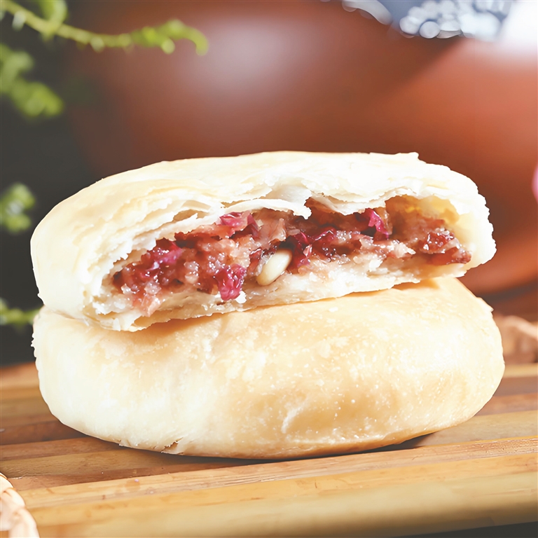 回到屋里,姥姥已经准备好烙饼的面团了。姥姥将面团放在一旁醒着,又开始精心处理那些已经剥好的松仁。她把松仁放在案板上,用刀细细地切碎,再用擀面杖擀一擀,拌上白糖和少许面粉,还不忘抓一把没擀碎的松仁放碗里。醒好的面团被分成一个个小面剂子,擀成薄厚均匀的面饼,满满两大勺松仁馅儿填塞其中,宽大的手掌拍一拍,便是一张饼的样子了。
