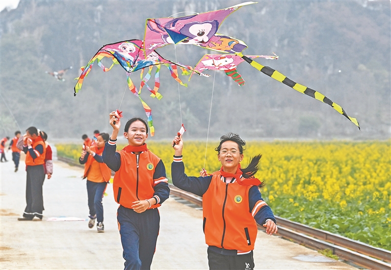 2月19日,在广西兴业县葵阳镇一处农田,学生们在机耕路上放风筝。