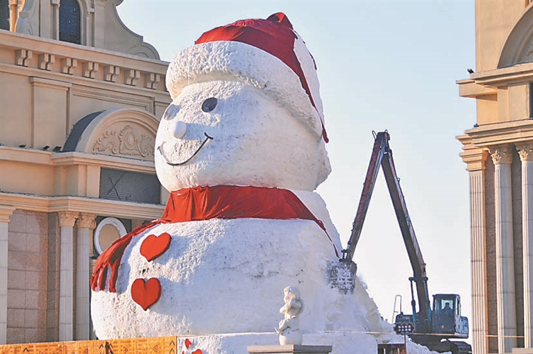 本报24日讯(记者马智博)24日,位于哈尔滨市道里区群力音乐公园的“网红大雪人”开启“年假模式”,再次与市民、游客说“再见”。