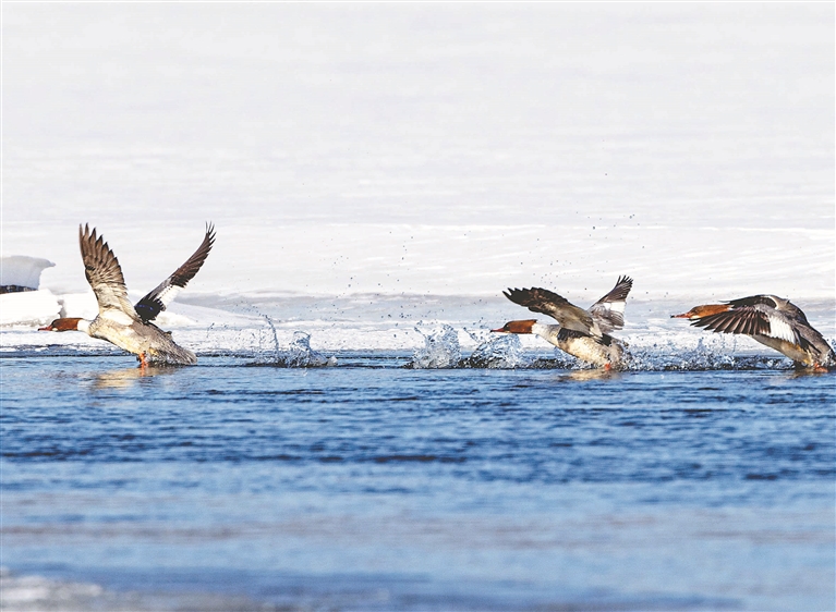 本报讯(黄晓光 记者郭俊峰)近日,国家一级保护动物秋沙鸭翩然而至,为小兴安岭的初春增添了别样生机。它们在澄澈的水面上悠然游弋,时而将头扎进水里,探寻着水下的美味;时而欢快地拍打着翅膀,溅起晶莹的水花。