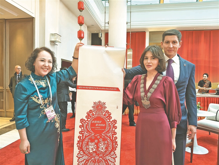 亚冬会期间,国际贵宾参观欣赏了黑龙江非物质文化遗产。兰西挂钱非遗传承人宋成玲为国际贵宾现场展示制作流程,其作品《冰雪同心·亚冬华彩》在现场深受关注。