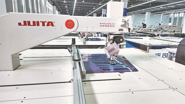 记者在二楼缝制车间部件自动化生产区看到,一台台排列整齐的“机器人裁缝”正高速运作。一名操作工人把裁剪成型的衣片放在模板上,轻轻按下启动按钮,机器便自动开始缝制,迅速且灵活。陆丽红说,他们所使用的是最新型的自动化模板缝纫机,能够完成复杂的绗线缝制。在这里一名工人负责2台~3台设备,效率高,品质标准也更加统一。