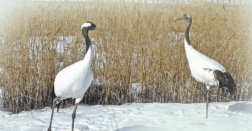 初春,扎龙湿地的冰雪还没有消融,放眼望去白茫茫一片,还有泛黄的芦苇荡随风摆动。“这两天风大,丹顶鹤都躲在芦苇荡里避风,你看前面那就有2只。”顺着黑龙江扎龙国家级自然保护区管理局(以下简称“保护区管理局”)饲养员徐惠手指的方向,记者看到2只成年丹顶鹤在芦苇荡里依偎着休息。