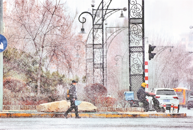 哈尔滨市的雪花落地后融化成水,未对道路交通造成影响。人们纷纷拿出手机拍摄精彩瞬间。