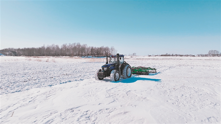 人勤春来早,万物始“耕”新。在同江市三村镇二村村的旱田地头,同江市鹏锦水稻种植合作社负责人王兆雷正在和司机沟通雪况墒情,根据地块积雪深度和地块面积,组织机械、人员进行耙雪化冻散墒作业。随着轰鸣的机车驶过,厚厚的积雪翻起层层“波澜”,黑土地露出了星点本色。