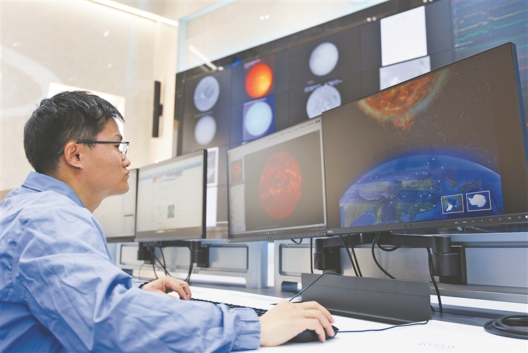 3月20日,在位于北京怀柔的子午工程综合信息与运控中心大楼,一名科研人员在空间环境预报中心监测太阳活动。